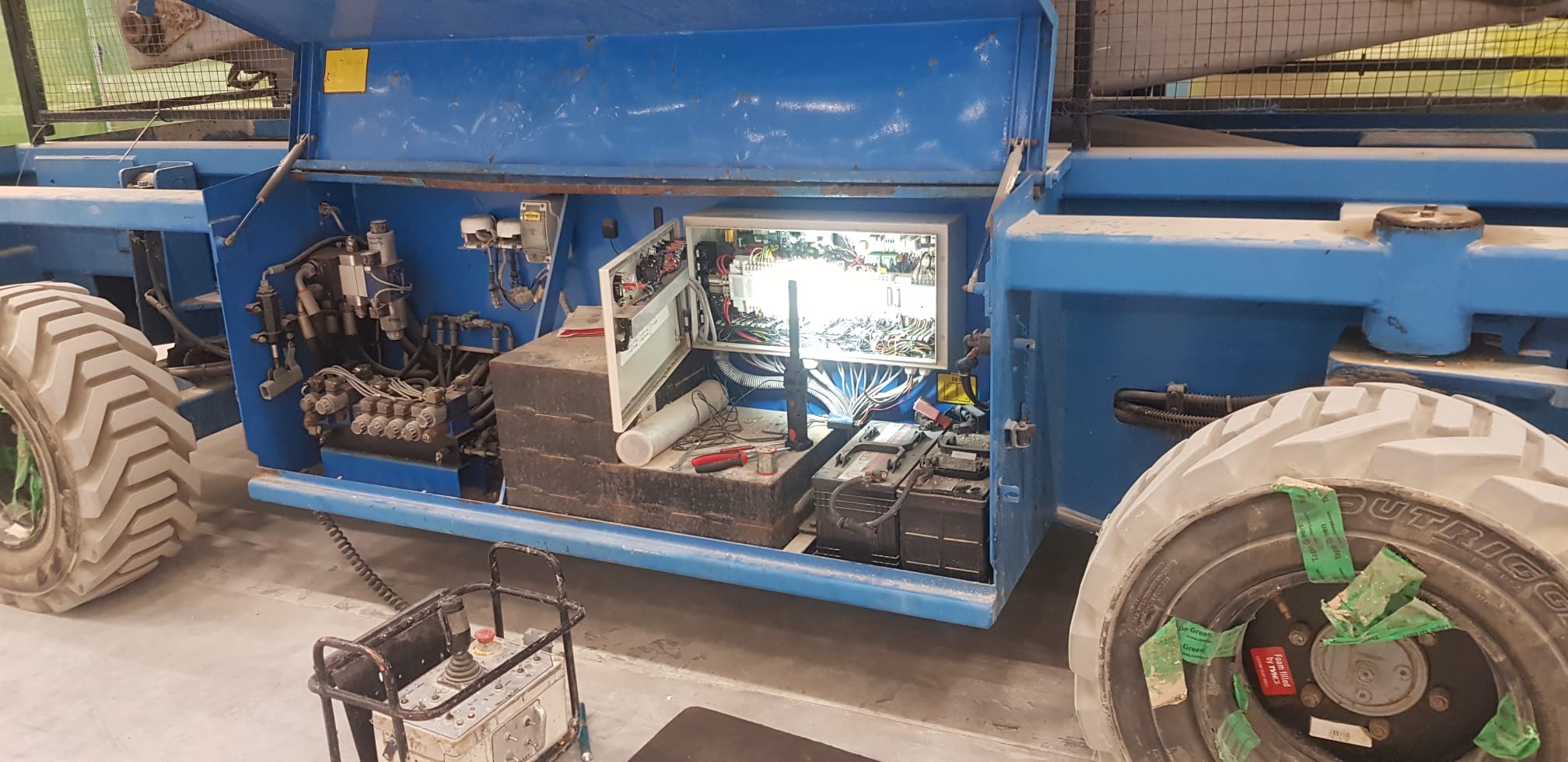 Con uno de nuestros talleres móviles, nos desplazamos hasta la obra donde se encontraba la Plataforma de Tijera Holland Lift de 22 metros de alcance, de nuestro cliente., a la que hemos realizado una reparación electrónica de la centralita principal.
