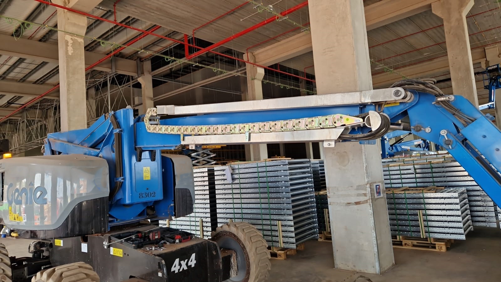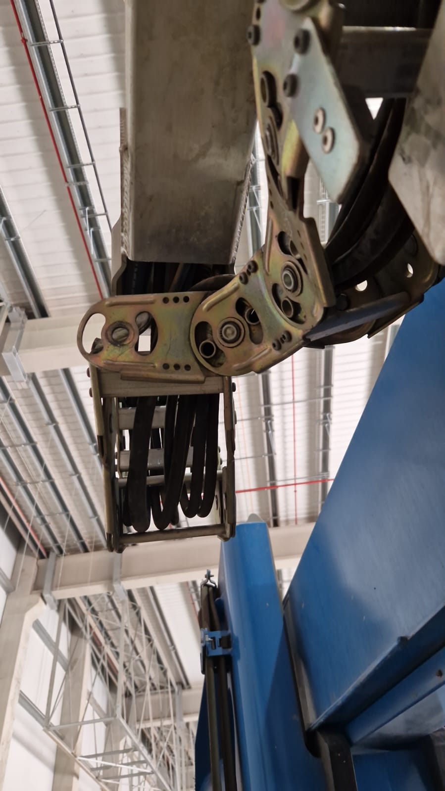 Sustitución de la cadena metálica porta-latiguillos que se había roto por un impacto en una plataforma articulada Genie de 20 metros de alcance.